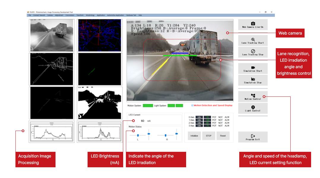 It refers to a testing system equipped with Lane Tracking Software that implements AFLS(Adaptive Front Lighting System) and applies it to Adaptive Cornering Lighting required for this purpose for the purpose of performance and aging testing of previously developed products.